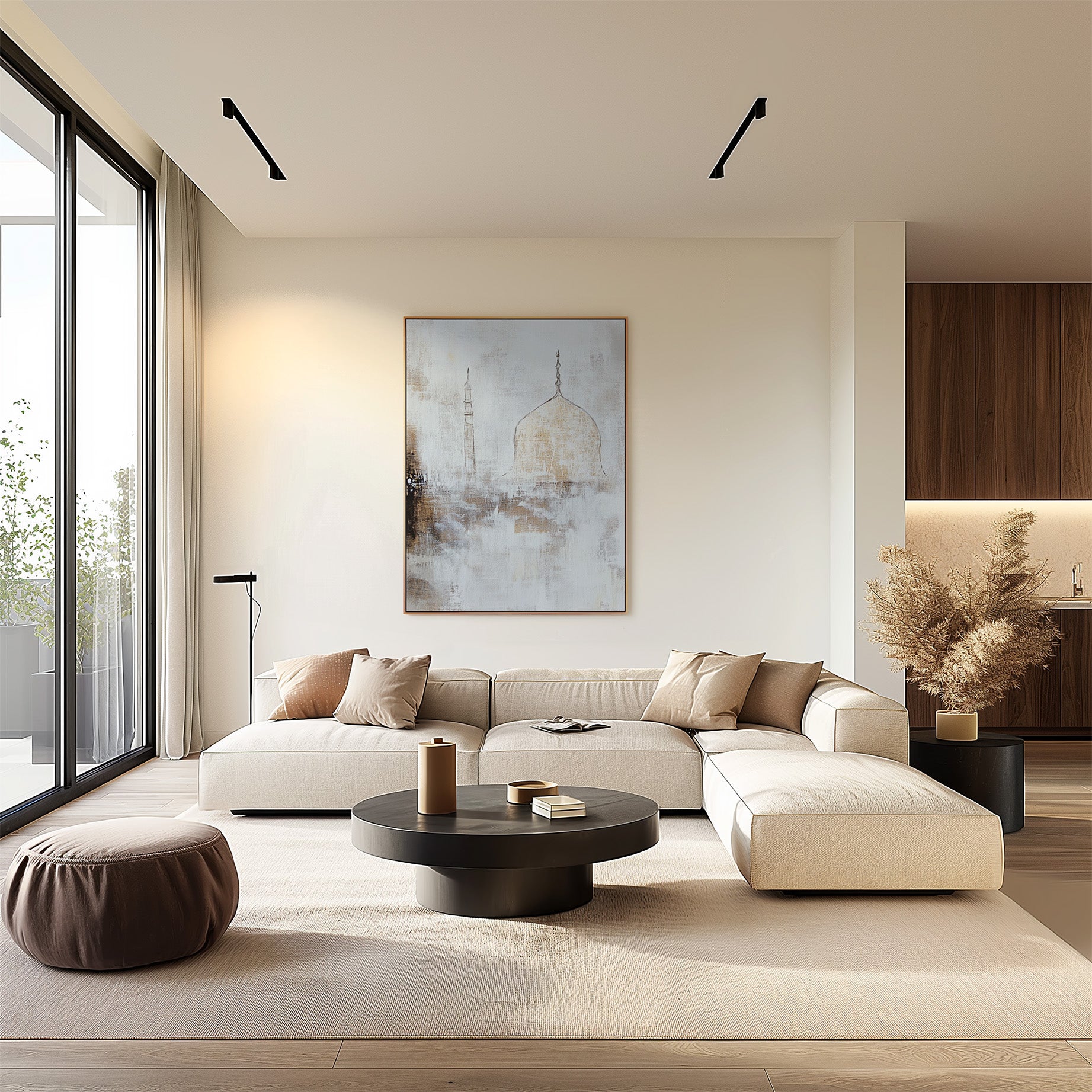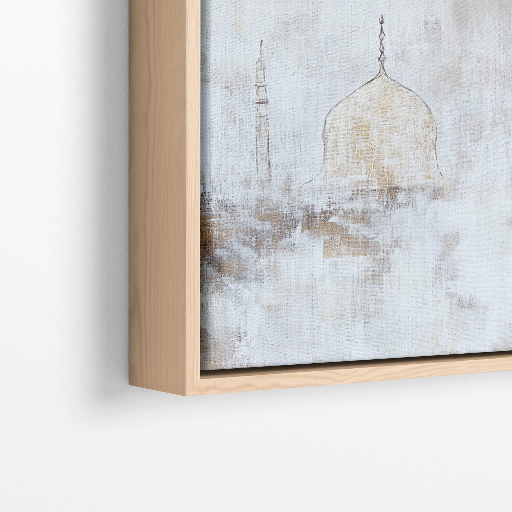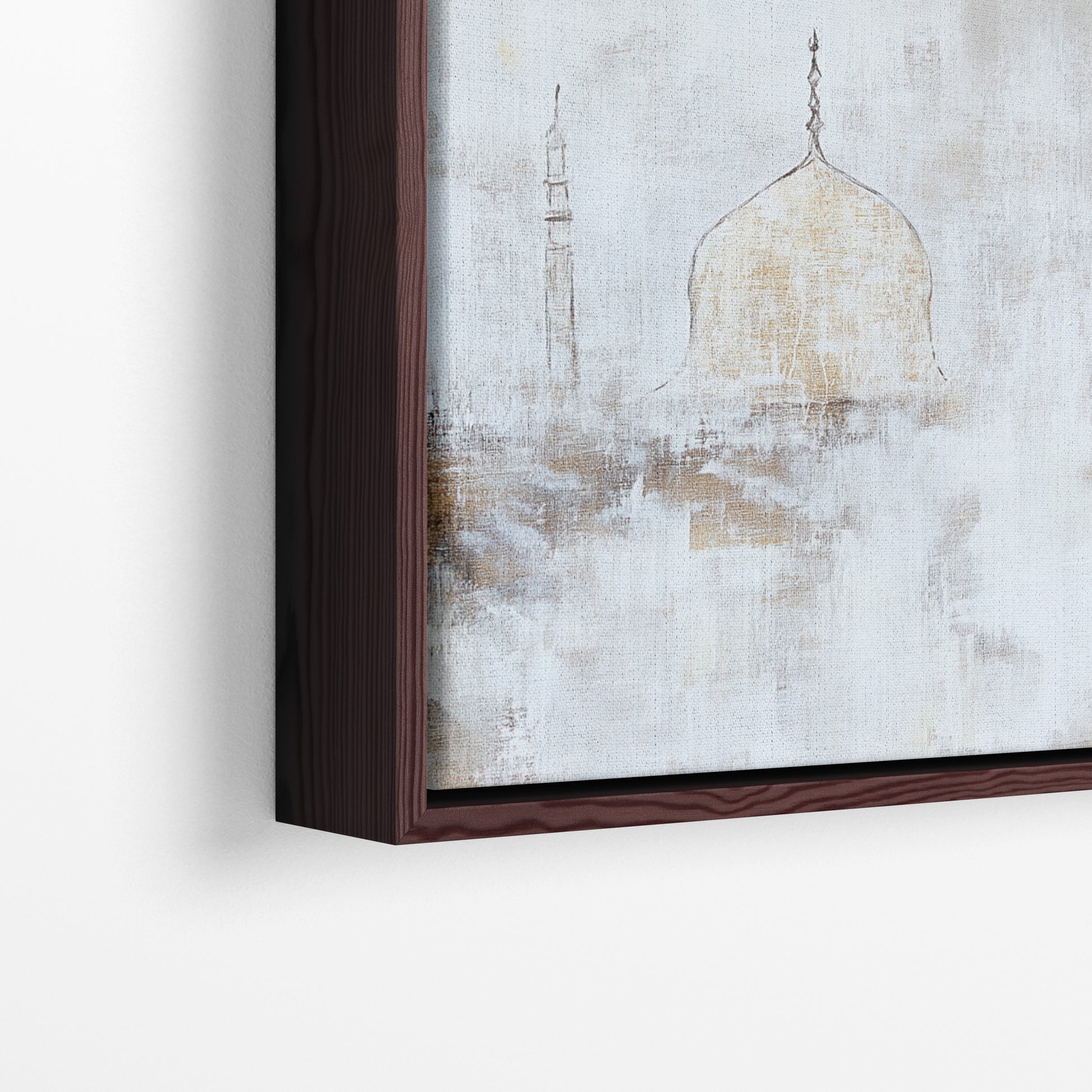 Golden Dawn captures the gentle beauty of sunrise using warm sand-like tones and soft abstract texture. The central dome rises gracefully from the mist, symbolising new beginnings, peace and spiritual grounding. This piece blends minimalism with luxury, creating a high-end aesthetic perfect for modern interiors.